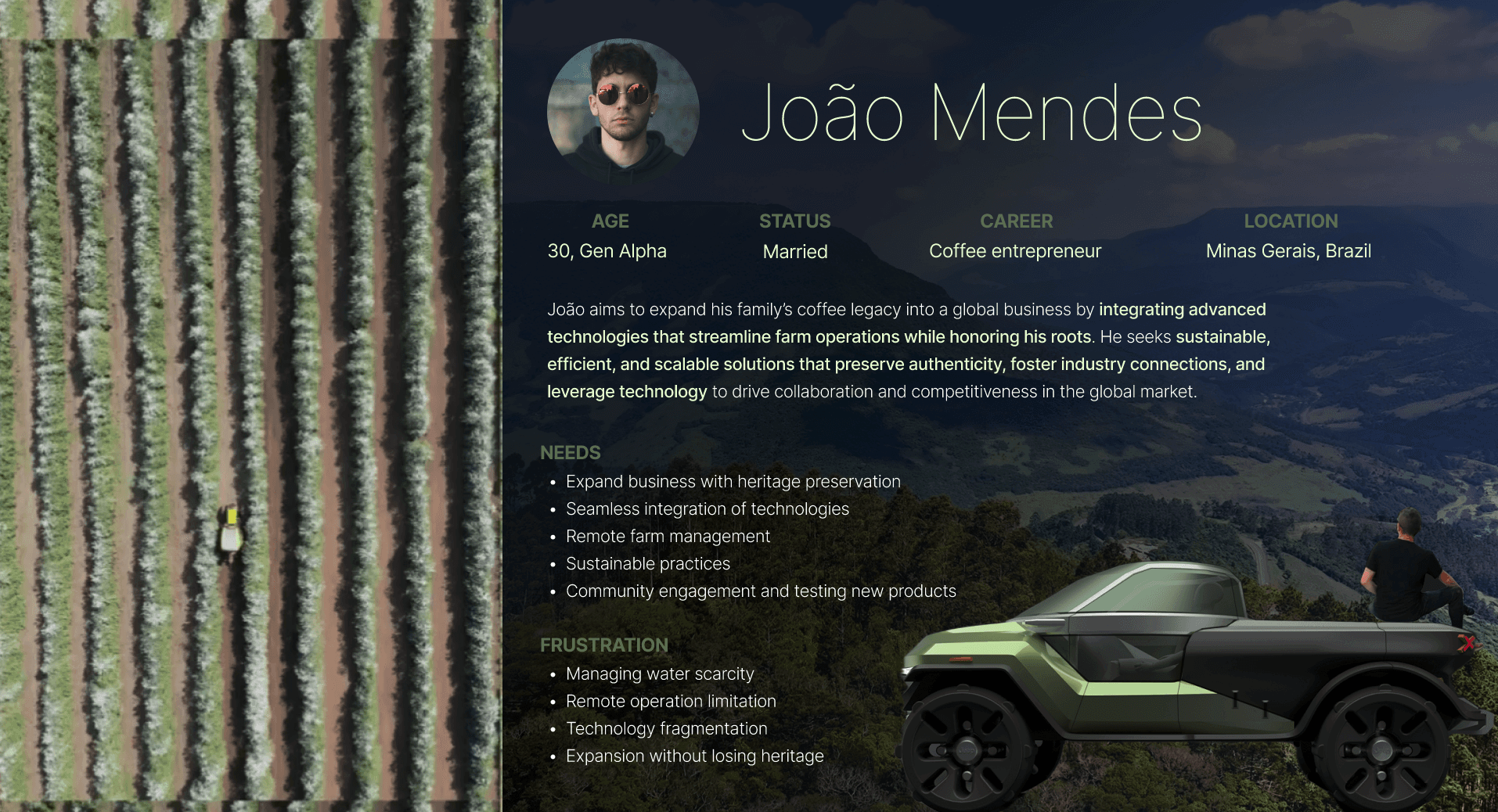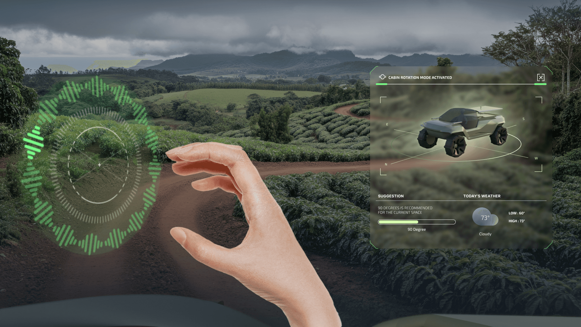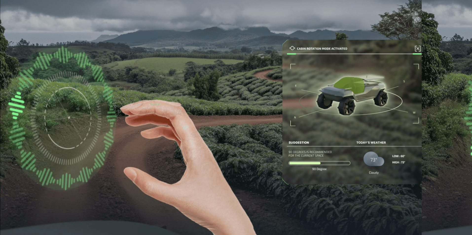 As the Jeep Razies cabin rotates, onboard sensors scan the coffee fields, and the UI reveals detailed insights on each bean, showing ripeness, moisture, and quality in real time for a seamless, immersive farming experience.