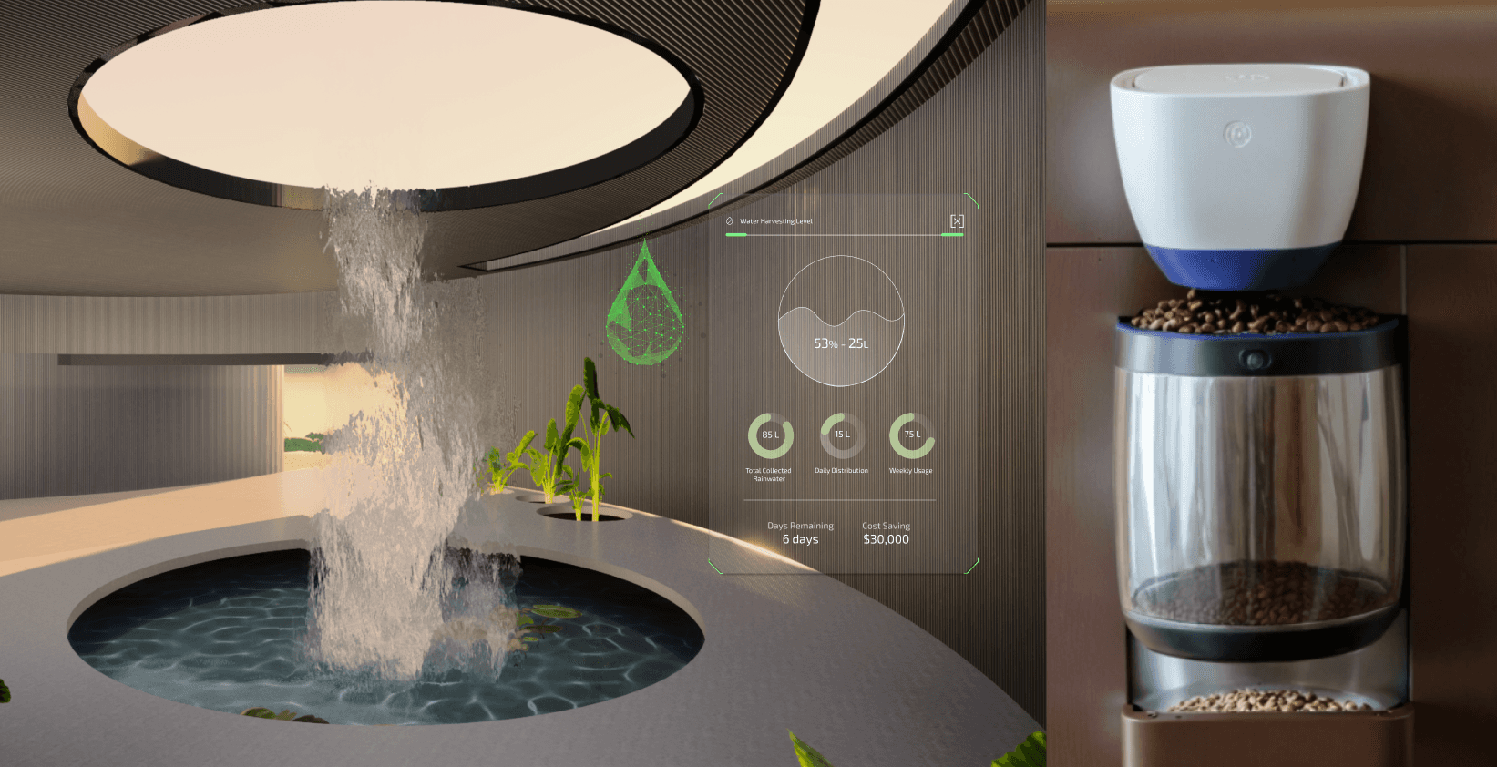 Collecting, filtering, and storing it for sustainable use.from daily needs to brewing coffee with a built-in analyzer that reveals each bean’s origin, flavor, and quality.