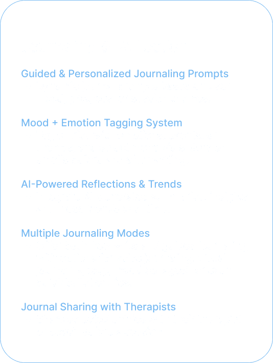 Reflection is a critical part of mental health progress, yet many tools lack structure or personalization. I designed guided prompts, mood tracking, and AI-generated insights that evolve based on user behavior and therapy sessions, creating a continuous feedback loop between self-reflection and professional support.