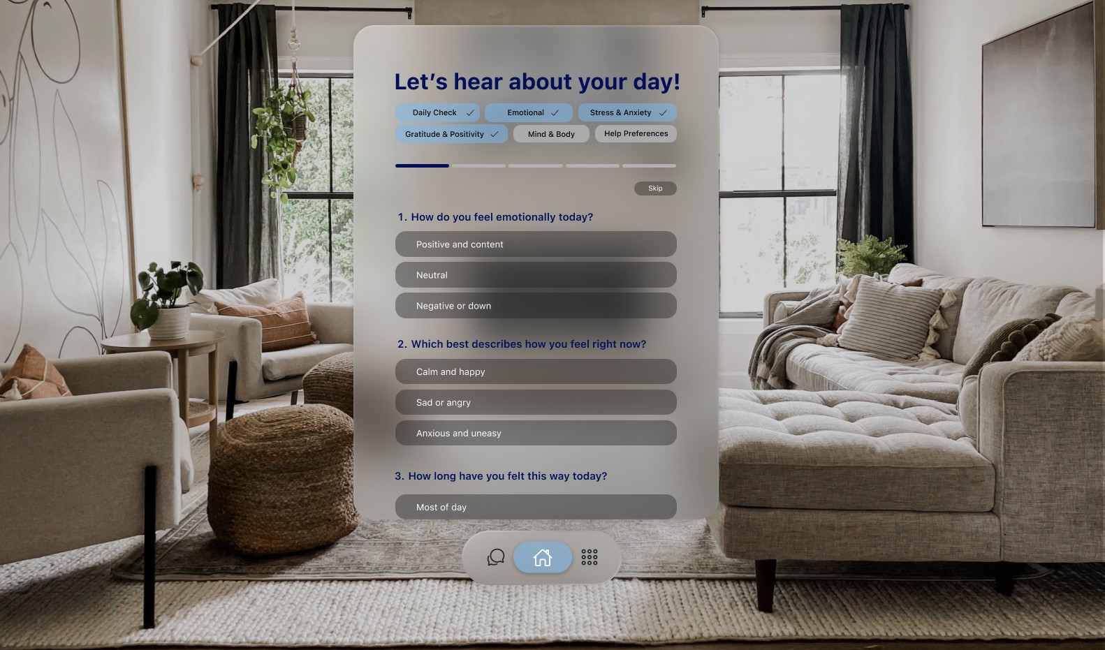Shifted from a structured form to a conversational flow with simple prompts and selectable options, making it easier for users to express how they feel.