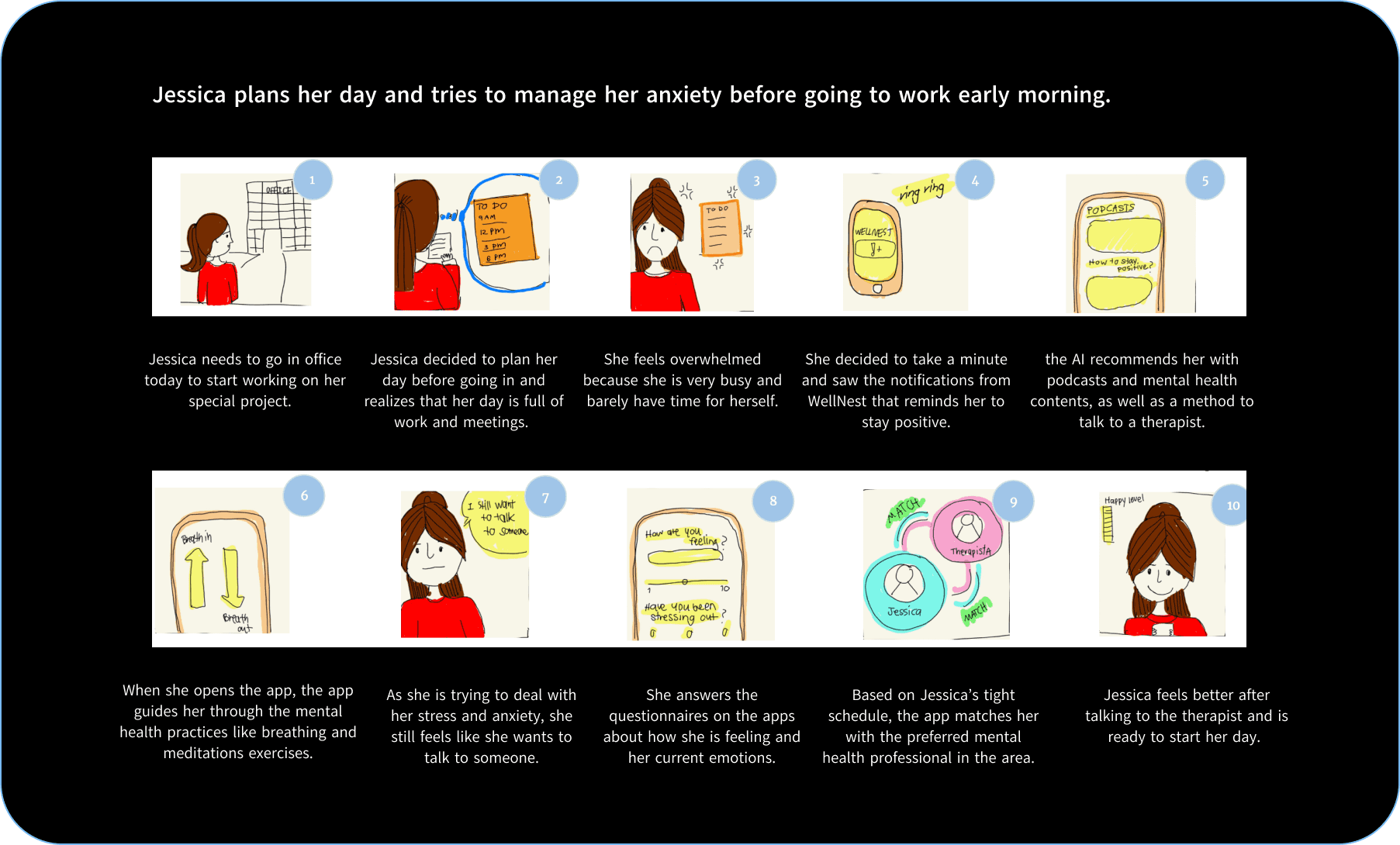 This scenario informed the design of WellNest’s adaptive support flow, ensuring users can transition seamlessly between independent coping tools and professional guidance.