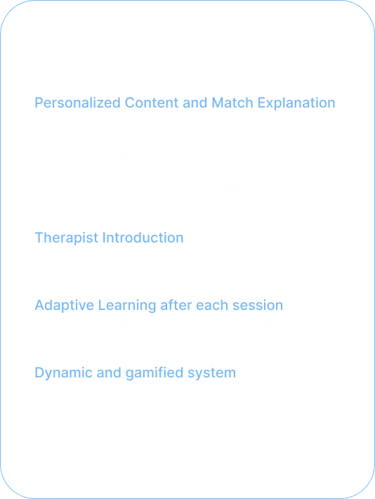 By connecting users with therapists aligned to their needs, preferences, and availability, the smart matching system goes beyond surface-level pairing to create a truly personalized experience.